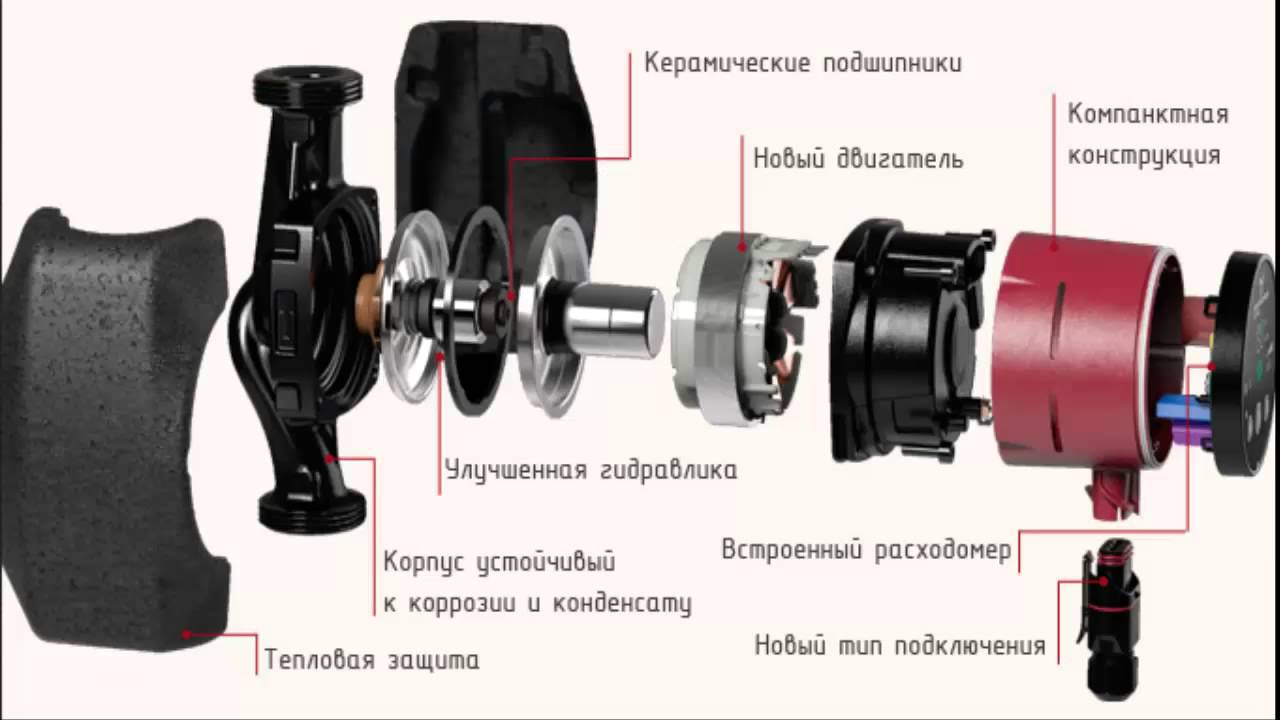 Устройство циркуляционного насоса с ротором «мокрого» типа базируется на модульном принципе. Модули могут быть укомплектованы в разные конфигурации. Все зависит от мощности и размера насоса.