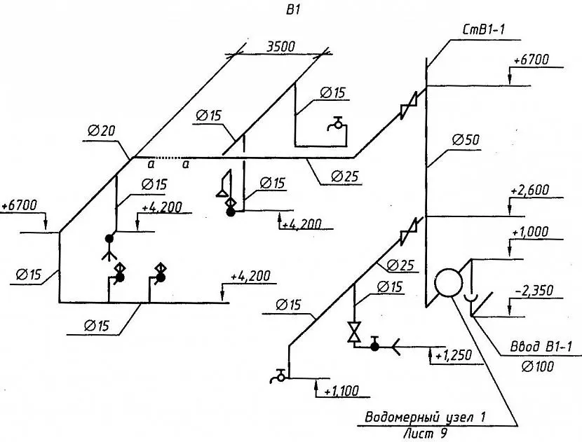 Аксонометрические схемы дают наглядное представление о расположении трубопроводов водоснабжения в зданий, о диаметрах труб и направлении их уклонов, о местоположении переходных муфт, запорных вентилей, задвижек, кранов и другой арматуры на трубопроводах, а также о местах спусков воды из систем водоснабжения.