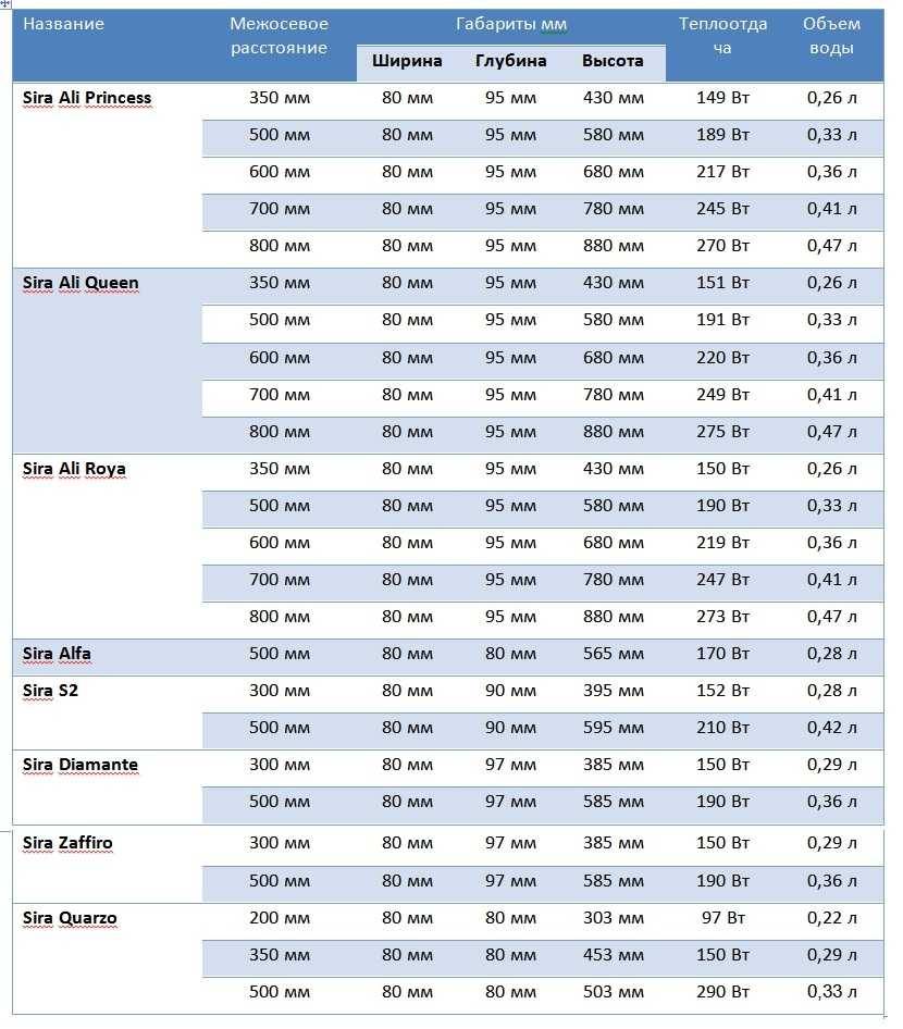 Технические характеристики алюминиевых радиаторов Sira сведены в таблицу. Диаметр коллекторов — один дюйм, рабочее давление — 16 атм