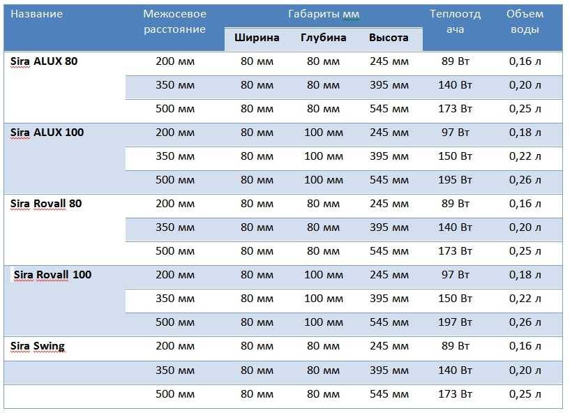 - RS-300 – межосевое расстояние 300 мм, объем – 165 мл, теплоотдача – 145 Вт;
