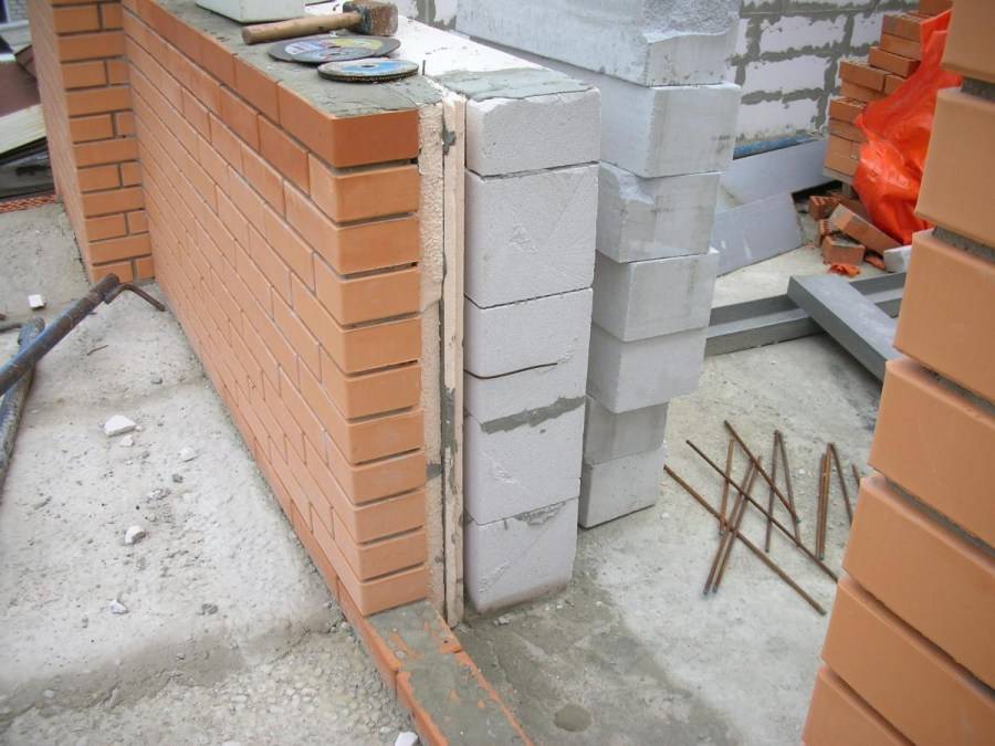 Крепить теплоизоляционный материал надо одновременно с возведением стен. Выложили на некоторую высоту, закрепили теплоизоляцию. Работать неудобно, но другого выхода нет.