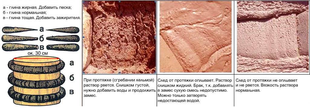 Чтобы быстро проверить качество и пластичность замеса, из него скатывается жгут диаметром 1—2 см, после чего наматывают его на подходящую палку (диаметром около 5 см). Если жгут не разрывается, если его можно немного вытягивать, консистенция раствора хорошая. Можно слепить небольшие шарики или лепешки и подсушить их на солнце или при помощи отопительного прибора — правильно замешенный раствор не потрескается.