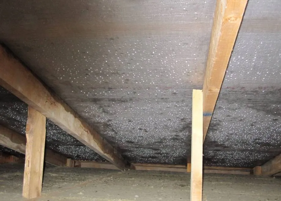Конденсат под крышей образуется по двум основным причинам: влага проходит сквозь дефекты кровли или холодный воздух попадает в теплое помещение.
