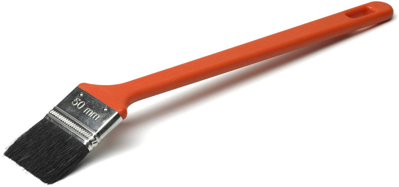 Учитывая небольшой зазор между батареей и стеной, грунтование и покраску удобнее выполнить валиком с маленьким диаметром – мини-валиком. Мини-валики редко появляются в широкой продаже, поэтому зачастую их приходится изготавливать самостоятельно из подручных средств, используя от стандартного валика лишь его держатель. Для нанесения краски на поверхность стены также можно использовать самодельные кисти или пуфики. В качестве рукоятки для них используют алюминиевую проволоку диаметром 0,8-10 мм, которую во время окрашивания можно изгибать под нужным углом. Кроме того в продаже есть радиаторные кисти. Радиаторная кисть — изогнутая кисть с длинной ручкой.