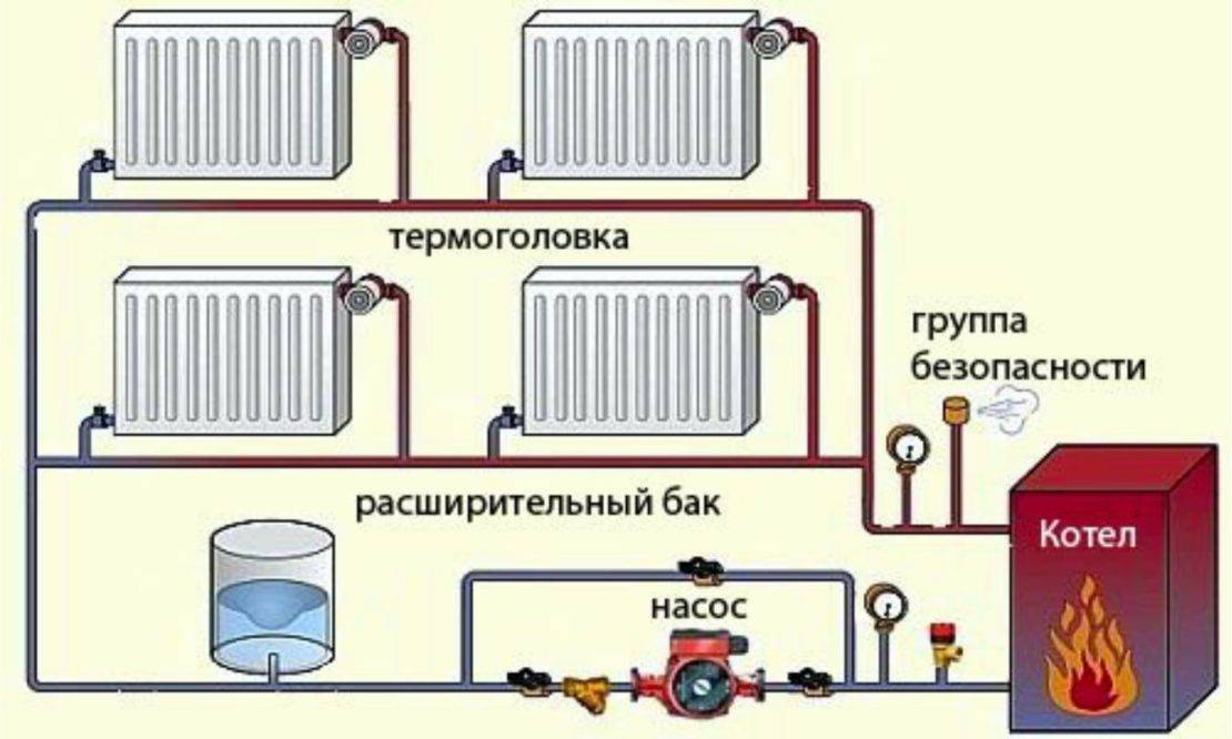 - Принудительные схемы дополнительно оснащаются циркуляционным насосом, реле и устройствами для сброса излишнего давления.
