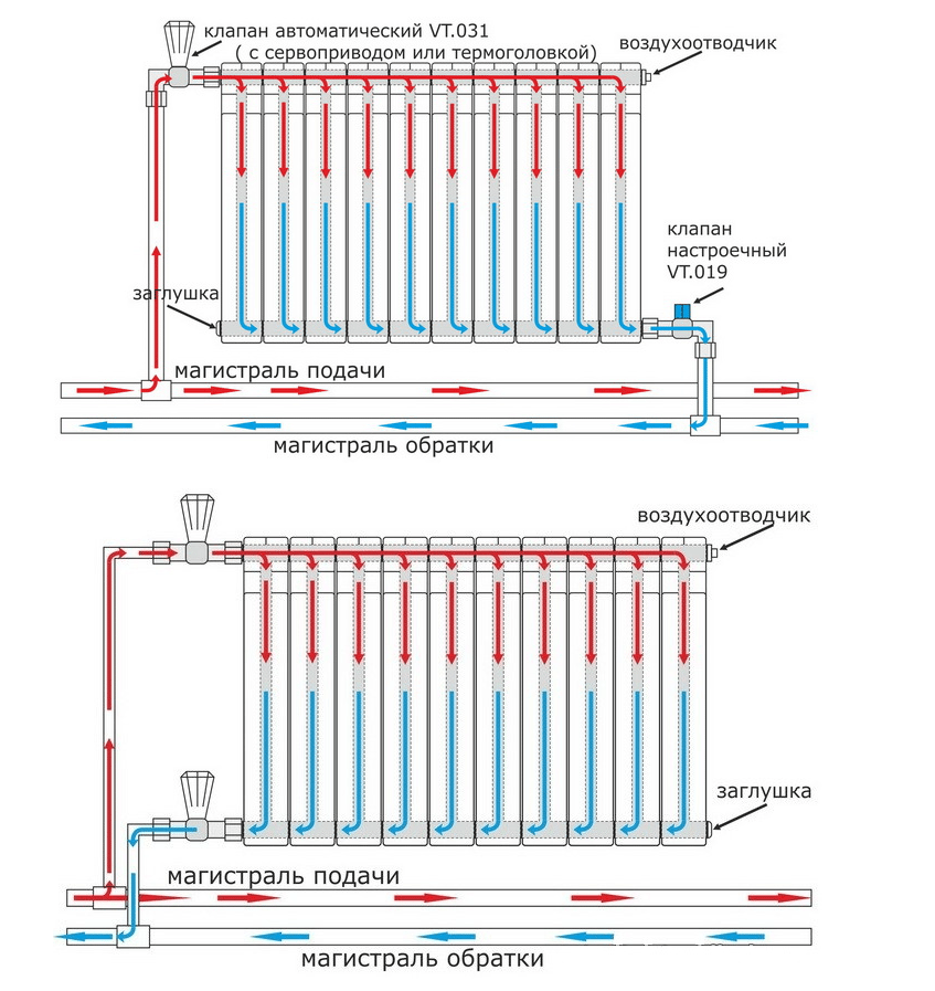 Двухтрубная | Теплоноситель подводится, отводится к батарее разными трубами, при монтаже используют параллельную схему подключения радиаторов. Это обеспечивает одинаковую интенсивность нагрева |