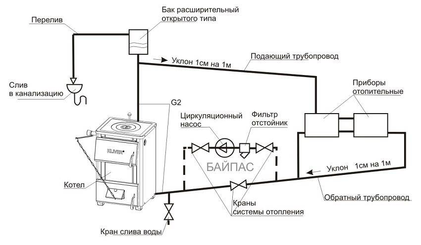 - расширительный бак любого типа, установленный вблизи твердотопливного котла (мембранного типа) или в верхней точке отопительного контура (открытый).