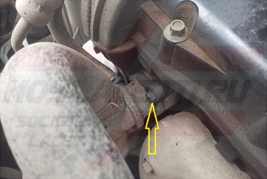 Теперь откручиваем два болта крепления термостата. Один вверху