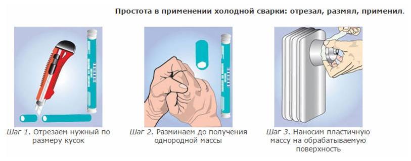 Среди материалов, используемых для заделки трещин, можно выделить средство для холодной сварки.