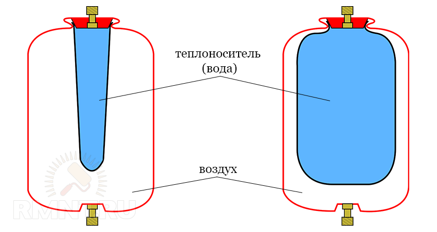Бак представляет собой герметичную емкость, внутри которой объем разделен на две части с помощью эластичной мембраны. С одной стороны имеется доступ теплоносителя через штуцер для подключения, с другой воздушная камера, в которой создается избыточное давление, как у автомобильных камер в колесах. Излишки теплоносителя при расширении поступают в бак, отводя мембрану в сторону воздушной камеры.