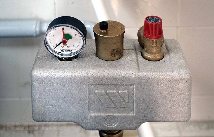 Для определения граничных значений и решения проблем с превышением допустимого давления или образованием газовых карманов используется группа безопасности с включенным в ее состав манометром, автоматическим воздухоотводчиком и предохранительным клапаном. Клапан срабатывает при превышении заданного максимального значения давления в контуре отопления и сбрасывает часть теплоносителя.