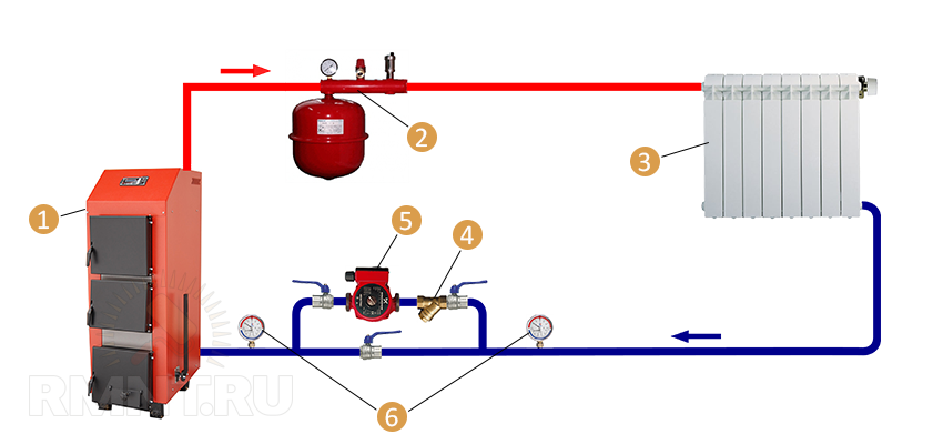 1 — котел; 2 — группа безопасности с расширительным баком; 3 — радиаторы отопления; 4 — фильтр грубой очистки; 5 — циркуляционный насос; 6 — манометры