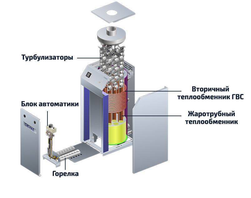 Устройство на примере двухконтурного Сигнал Комфорт. Усиленный теплообменник, турбулизаторы, замедляющие отход газов, конструкция по прежнему простая, а функционал органов управления ограничен.