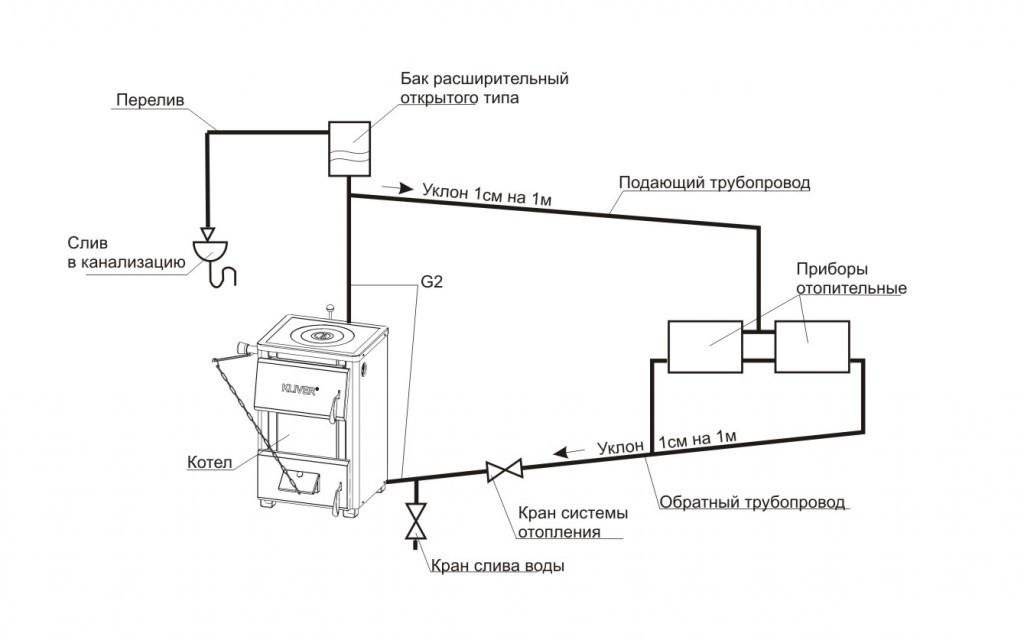 В котле сгорает топливо (дрова, брикет и так далее). По подающему трубопроводу нагретый теплоноситель доставляется до радиаторов. Здесь теплоноситель отдает часть своего тепла в окружающую среду. Посредством обратного трубопровода остывший теплоноситель попадает обратно в котел. Расширительный бачок нужен для непрерывной подачи теплоносителя в систему отопления.