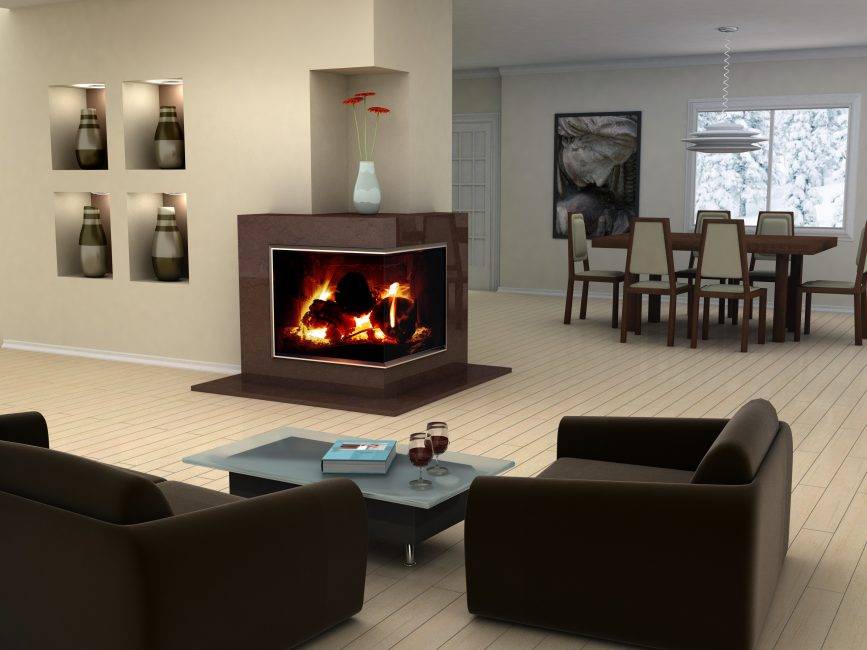 На современном рынке предлагаются камины с различными обрамлениями – это могут быть изделия, в которых ширина значительно будет превышать высоту либо модели в виде треугольника. Они подчеркнут индивидуальность и стиль помещения, придадут уют и комфорт. Непосредственно в близости от него можно установить стеклянный стол с красивыми яркими стульями, диванами.