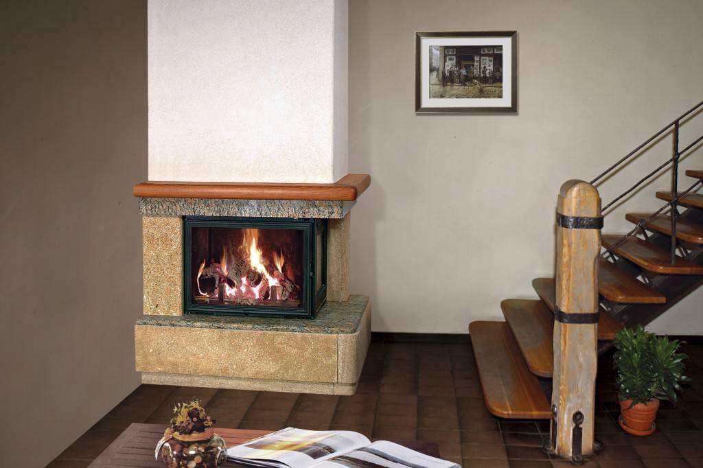 - Тип установки – печи-камины, изготавливаются с облицовкой из камня и стали, керамическими панелями, увеличивающими теплоотдачу. Популярностью пользуются устройства в угловом исполнении.