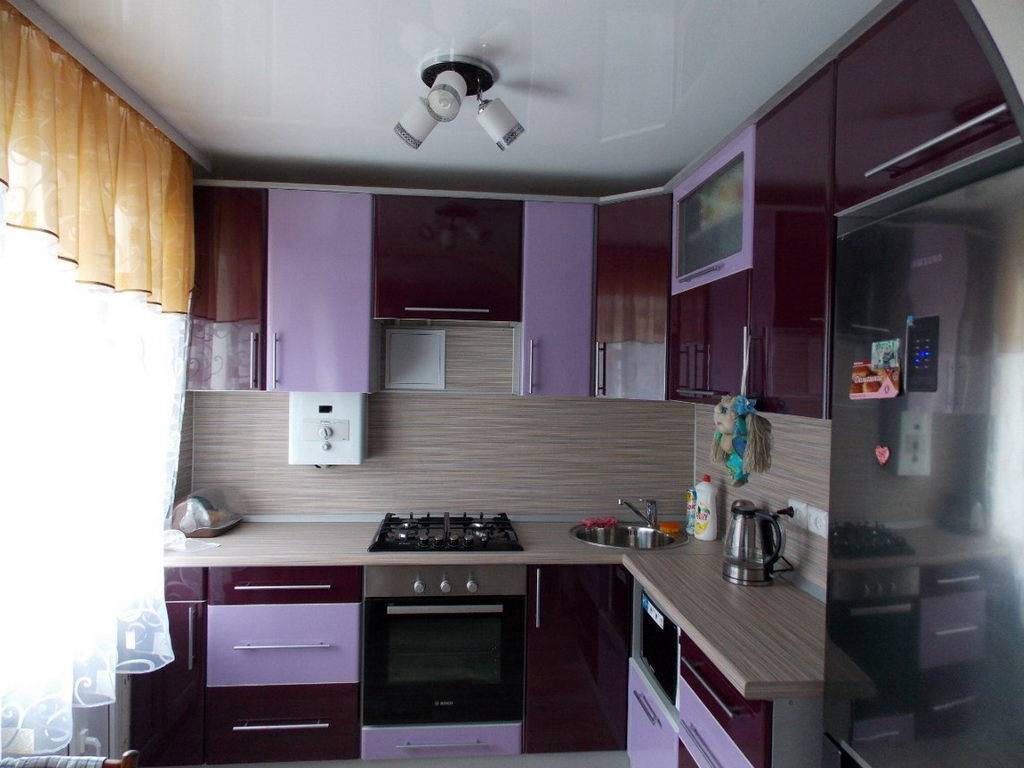 При такой планировке кухонный гарнитур находится вдоль двух перпендикулярных стен. Это очень удобный вариант для хозяек, поскольку при нем соблюдается так называемый принцип треугольника, т.е. визуальное объединение мойки, плиты и холодильника. Такое размещение ускоряет процесс приготовления пищи и обеспечивает комфортное пребывание на кухне. Газовая колонка обычно находится в углу и прячется за мебельным фасадом, с легкостью помещаясь в подвесном шкафчике.