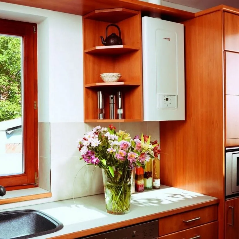 В маленькой кухне следует максимально использовать пространство в высотуГазовая колонка в открытом виде может стать украшением рабочей зоны