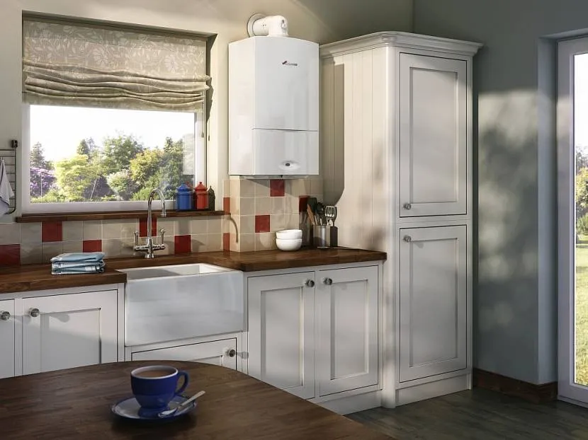 Открытым — колонка размещается между шкафами. Если они будут совпадать по цвету и высоте, газовая колонка будет практически незаметна. Можно наоборот сделать акцент на колонке и оформить её в другом цвете, но при этом она должна гармонировать с другими элементами интерьера. Трубы и гофры при этом лучше скрыть в отдельный шкафчик.