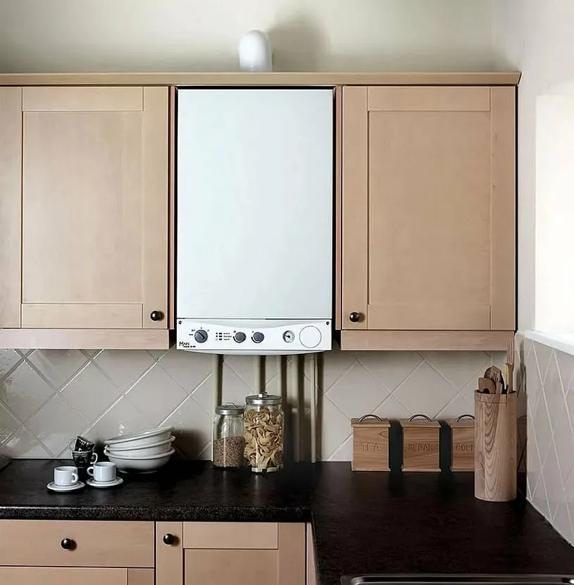 Этот вариант позволяет полностью спрятать газовую колонку в один из навесных шкафов. Чаще всего его используют, когда составить органичный интерьер кухни в хрущевке с газовой колонкой не представляется возможным, и единственным вариантом является спрятать ее от посторонних глаз.