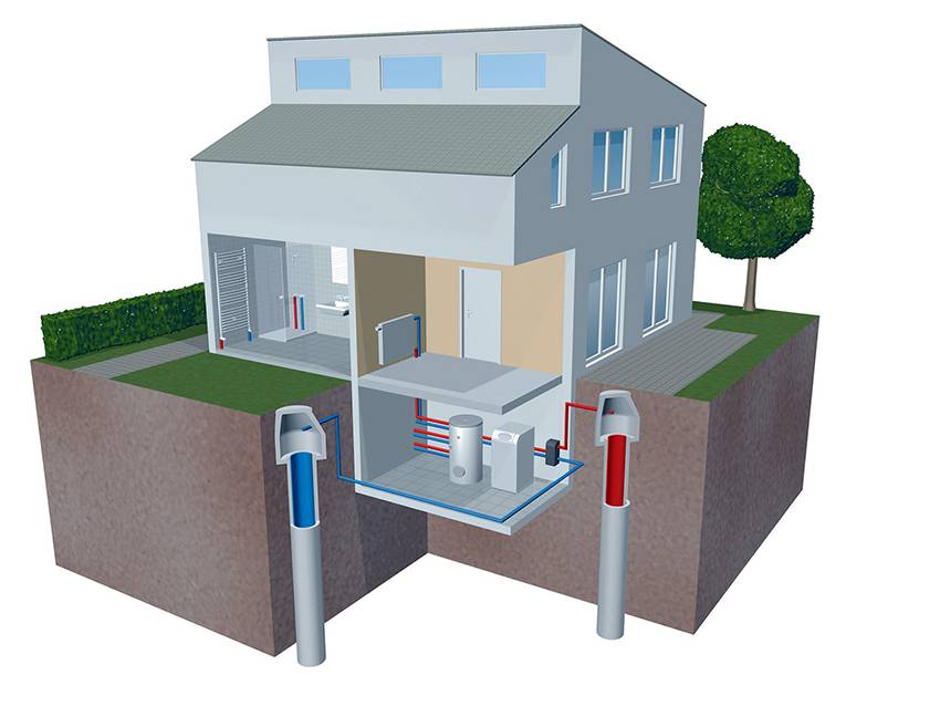 В этом случае используется забор тепла от подземных вод, что значительно повышает тепловую эффективность системы отопления. Это происходит благодаря более высокой температуре влаги и значительному коэффициенту теплообмена.