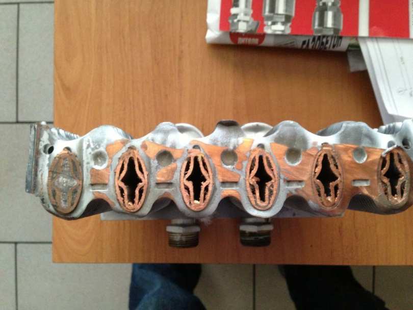 В связи с тем, что перед попаданием на нагревательные элементы вода не фильтруется (про выбор фильтра для отопления почитайте в отдельном материале), поэтому осадок часто остается на внутренних поверхностях газового котла. Детали постепенно теряют свою функциональность. Проблемы начинаются с теплообменных элементов. Далее осадок образуется на стенках радиаторов, трубах, это сокращает пространство, по которому должна течь вода. Избавиться от накипи довольно просто, достаточно открыть газовый котел и прочистить его с помощью специальных средств. В этом случае страдает только износостойкость самого оборудования. Чтобы избежать подобных проблем в будущем, достаточно проводить периодические профилактические чистки.