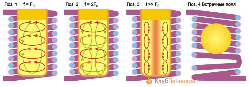 Вследствие этого индукционные печи для плавки металла работают чаще всего на 2-й, 3-й и др. высших гармониках (Поз. 2 на рис.) Требуемая для разогрева/расплавления мощность при этом возрастает; для того же полкило стали на 2-й понадобится 7-8 кВт, на 3-ей 10-12 кВт. Но прогрев происходит очень быстро, за минуты или доли минут. Поэтому и КПД выходит высокий: печка не успевает «съесть» много, как расплав уже можно лить.