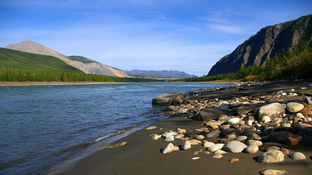 Красивые берега Индигирки – это горные хребты, нагорья, цепи, порою сменяющиеся впадинами и низменностями. Бассейн реки сформировался на месте горных пород, давно замёрзших под влиянием климатических условий с низкими температурами. Около берегов имеется много аллювиальных грунтов. Условно путь течения можно разделить на горный участок протяжённостью 640 км и равнинный, имеющий длину приблизительно 1 086 км. Вместе с истоками длина реки Индигирка достигает практически 2000 км. Но чисто сама она, официально начинающаяся от точки слияния двух истоков, имеет длину 1 726 км, при площади бассейна, изобилующего множеством устьев, порогов и дельт, в 360 тысяч кв. км. От моря Индигирка отделена небольшим и довольно мелководным заливом. Ширина реки по всей её длине различна и варьируется в пределах от 0,5 км до 20, а глубина – от 7,5 и до 11 метров.