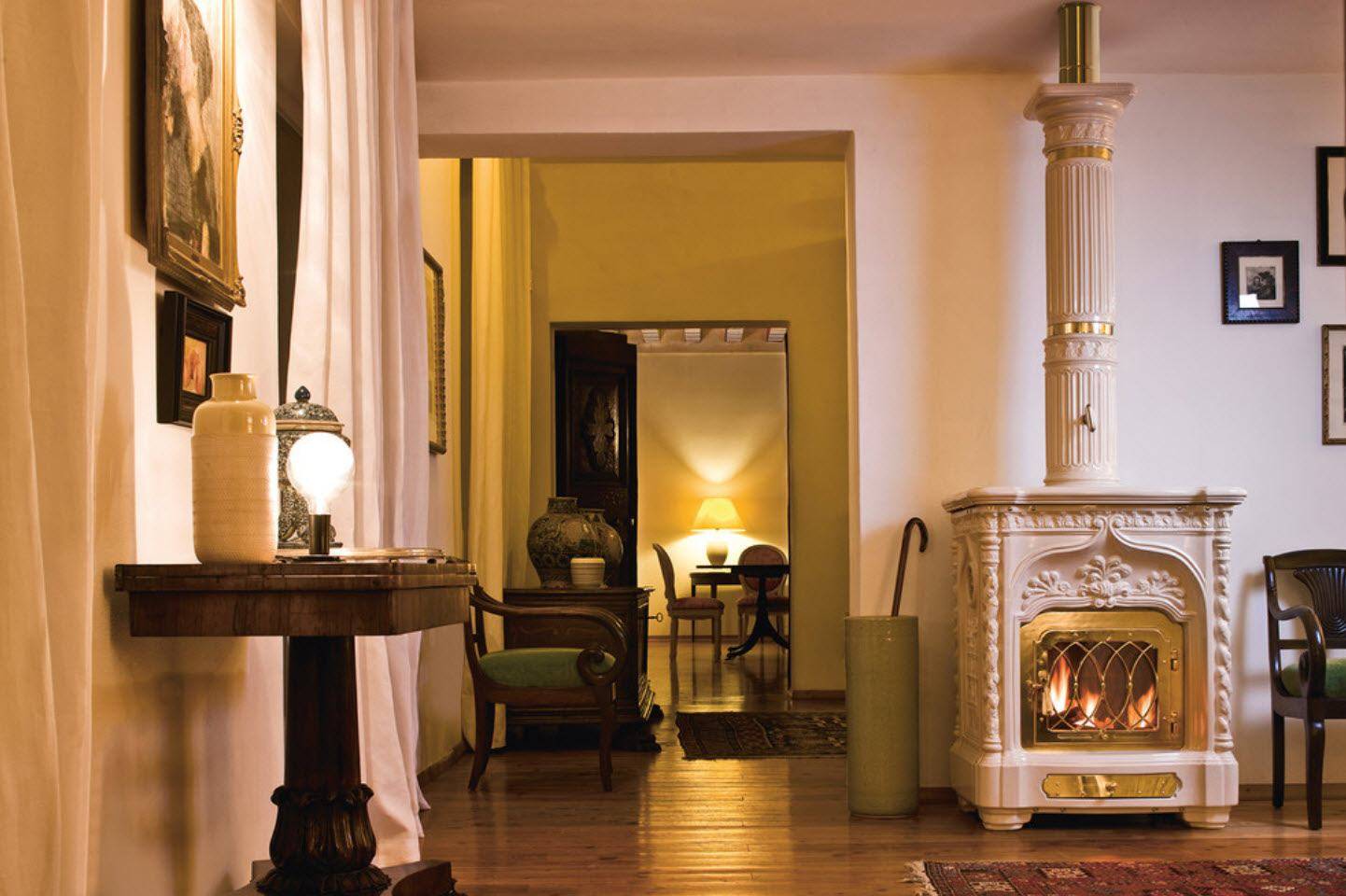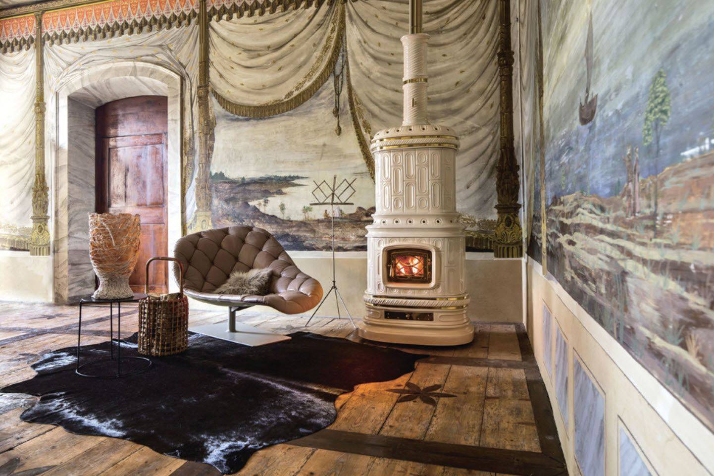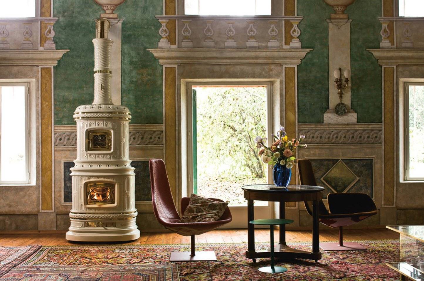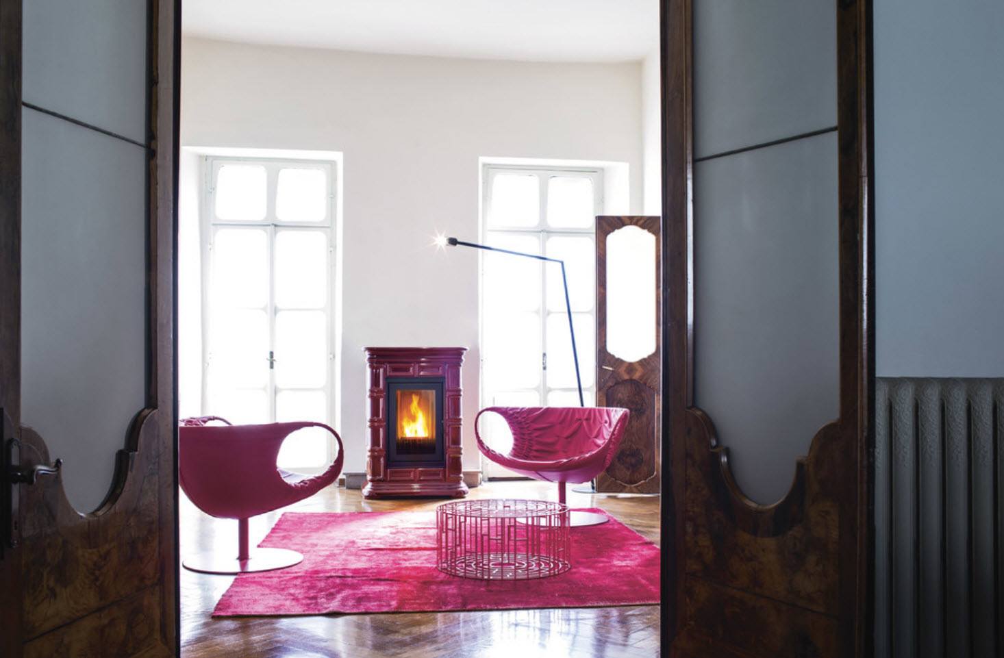 Важно не только удачно подобрать форму комнатной печи и облицовки ее портала, а и правильно организовать пространство вокруг очага
