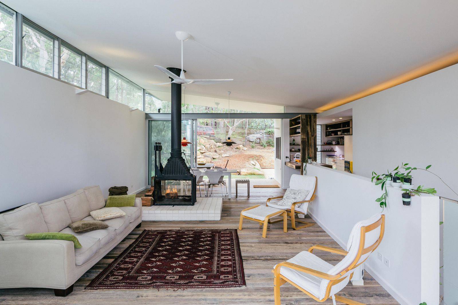 Обыграть скупость минималистического камина в интерьере, который кажется просто вырубленным в стене и лишенным всяческой отделки, можно, дополнив пространство идентичной по геометрии мебелью. Скупость же форм в целом компенсируется игрой светотеней и цвета.
