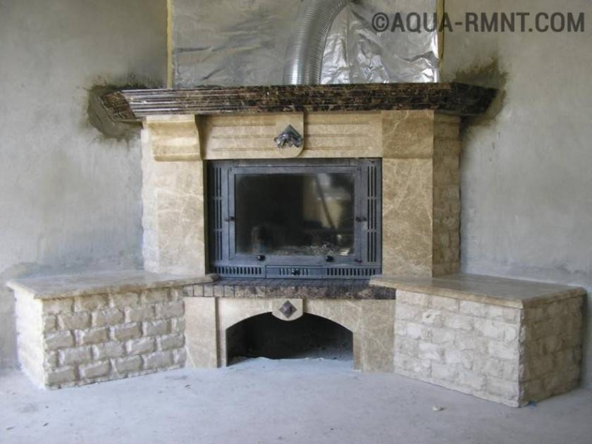 Специфическое название получено по стране, в которой популярны именно такие решения. Данный способ монтажа позволяет основные функциональные части разместить внутри стены. Снаружи – только портал, небольшая полка. Явным преимуществом является экономное использование свободного пространства. Надо позитивно отметить возможность обогрева соседней комнаты.