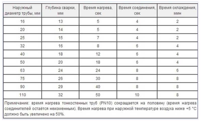 | Диаметр трубы наружный (мм). | Глубина посадки (мм.) | Время нагревания (сек.) | Время фиксирования (сек.) | Время полного остывания (мин.) |