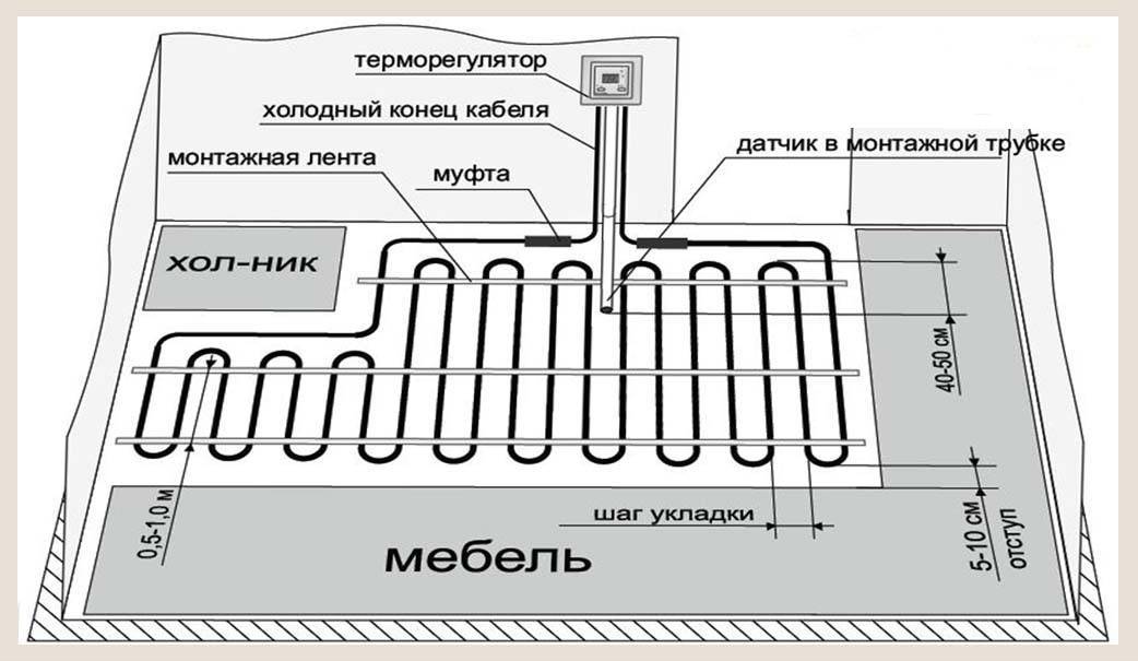 - нагревающего кабеля в надежной изоляции, имеющего большое сопротивление. Он вырабатывает тепло при прохождении через него электрического тока;