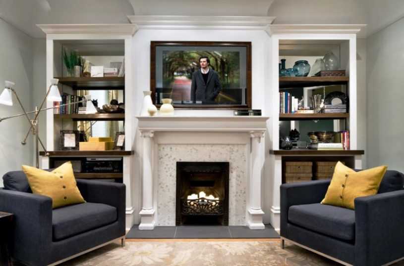 Дизайн интерьера с гостиной с декоративным камином электрическим организуется по тем же принципам, что и с очагом дровяным или газовым. Такая модель является эффективным обогревателем и может очень удачно имитировать настоящее живое пламя.