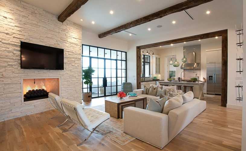 При этом каминную зону отдыха следует располагать у окна. Встроенный камин в гостиной вполне компактный и идеально разделяет пространство помещения. Доминирующим цветом в таком помещении можно выбрать один из оттенков молочного цвета.