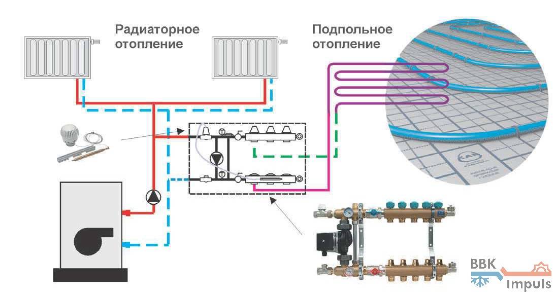 Это основное условие установки. Схема отопления теплый пол и радиаторы может быть подсоединена двумя способами.