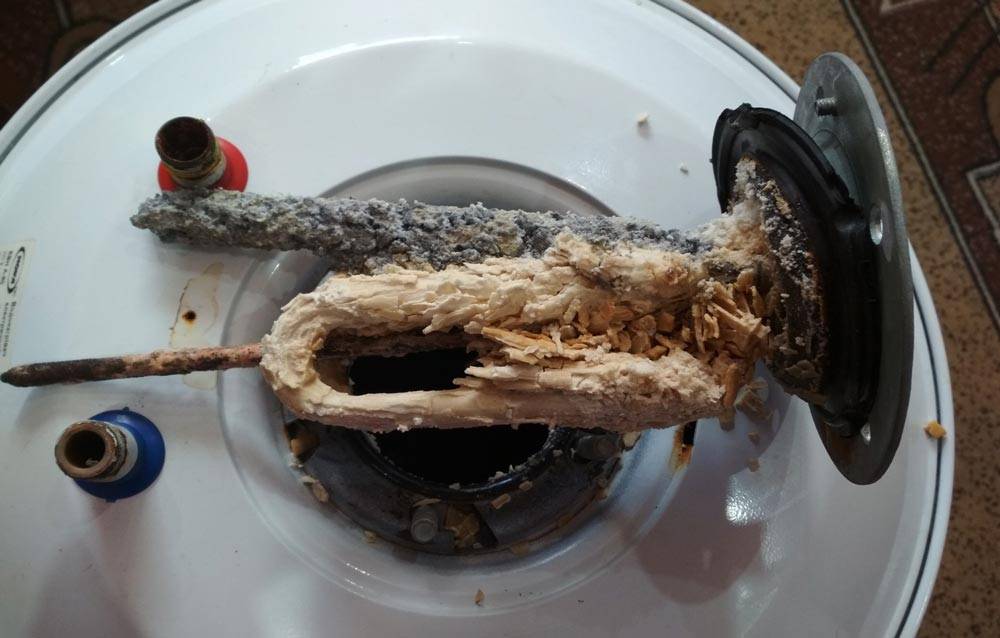 Магниевый анод защищает от разрушения нагревательный компонент. Наличие рыхлого осадка говорит об уменьшении теплоотдачи и перерасходе электричества.