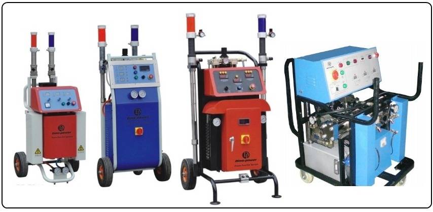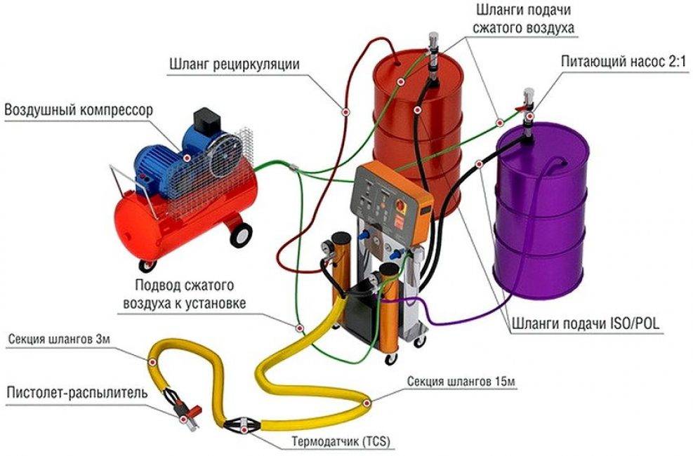 - Распыляющий пистолет и шланги. Шланги от компрессора к подающим насосам называют подающими, а соединяющие насосы с дозатором — рециркуляционными. К пистолету также идут 2 шланга, объединенные в общий рукав для удобства работы. Непосредственное смешивание компонентов происходит в пистолете.
