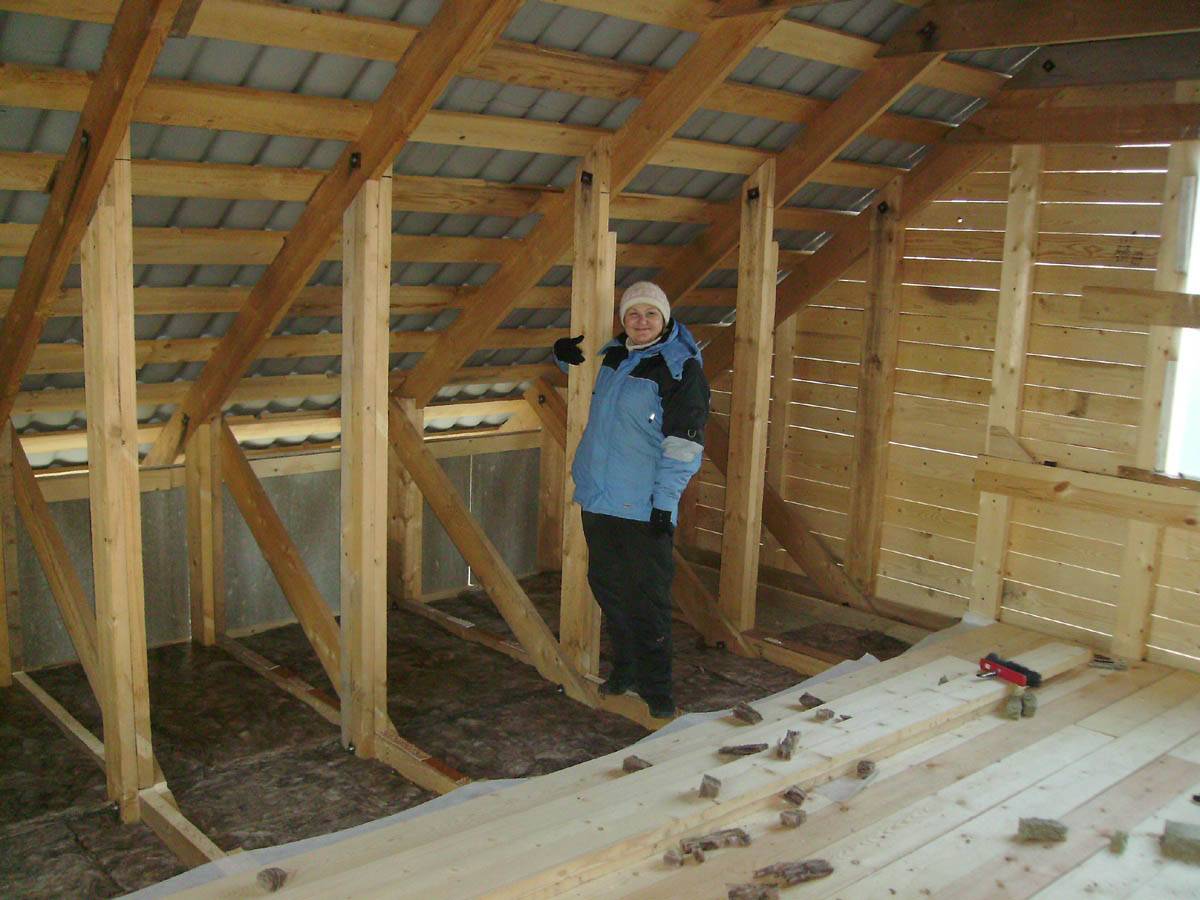 Минвата укладывается в несколько слоев, ее толщина примерно равняется 15 см. Сверху минеральной ваты и лаг крепится пароизоляционная пленка на двухсторонний скотч. Поверх пленки настилается фанера, OSB или доски, таким образом, чтобы краями они плотно упирались к стенам. Благодаря этому влага и пыль не будет попадать в дом.