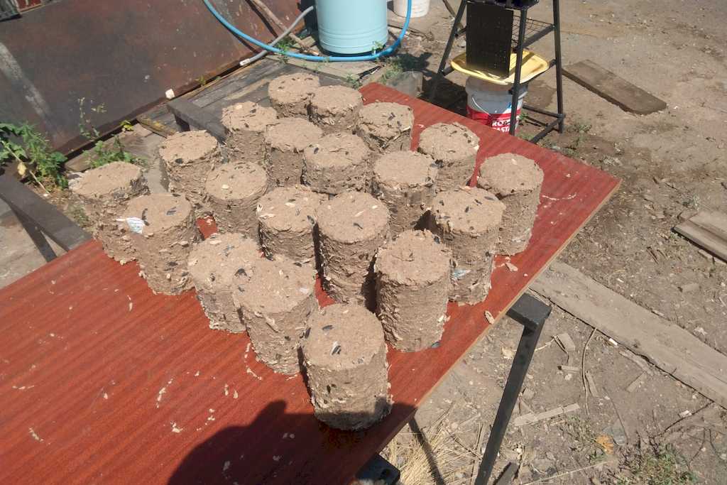 По упрощенной домашней технологии прессовать брикеты можно используя в качестве исходного материала бумагу, листья, шелуху, сухую траву, солому. Самому можно также изготавливать торфяные брикеты и изделия из угольной пыли. Перед сжиманием замоченное в воде сырье нужно смешать с глиной в пропорции 10:1 и после добавить используемое связующее.