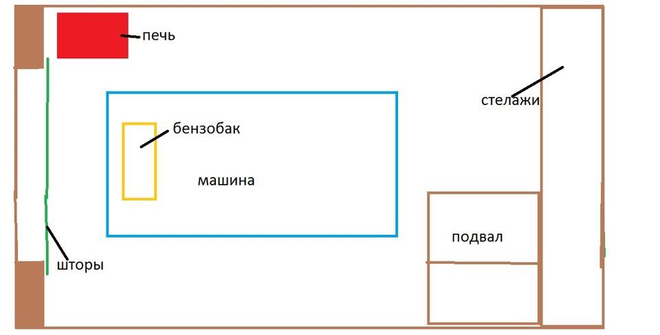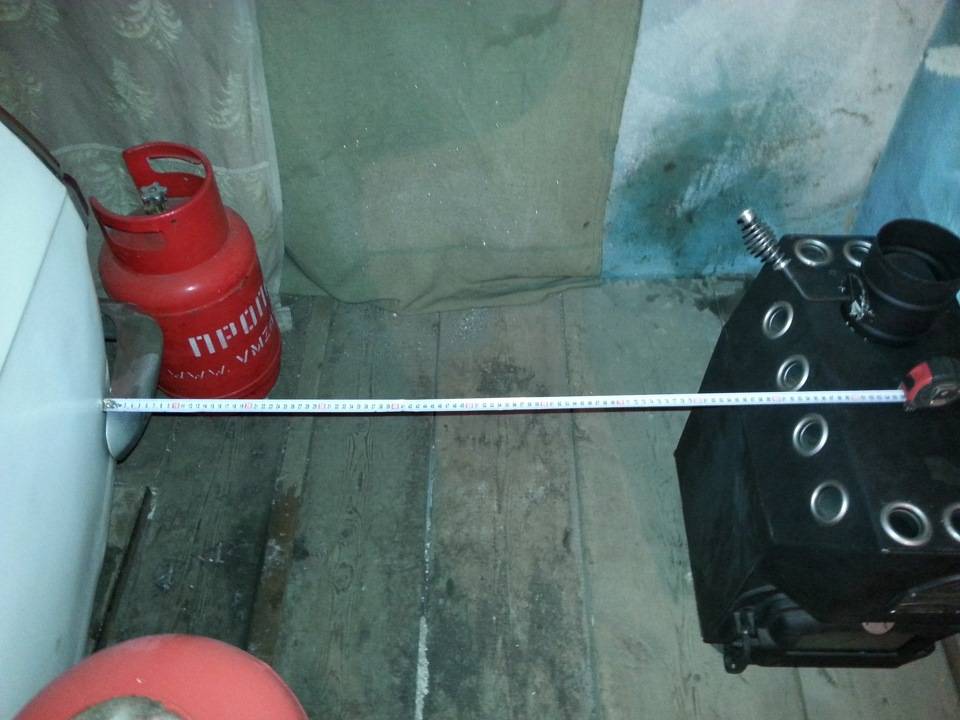 2) Второй вариант, по правила с отступом 50 см. Но печка при этом будет находиться около бензобака и это мне не нравиться, расстояние между печкой и машиной 90 см.Так же стена с воротами обмерзает инеем, при топке все это побежит