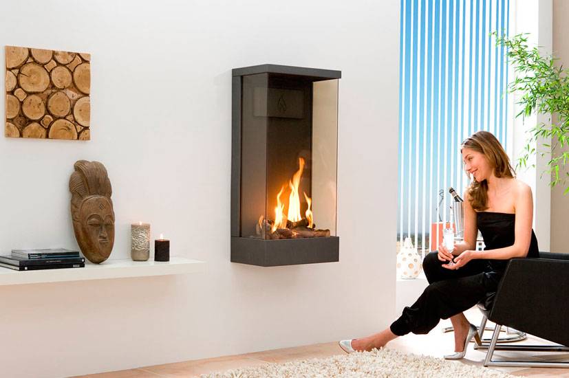 У свободной стены. Импровизированный очаг может выполнять роль самостоятельного декора. Визуально дополняет интерьер, если разместить его под зеркалом. Верхняя часть при этом служит полочкой для гигиенических принадлежностей. Стационарные модели используют вместо тумбы для телевизора.