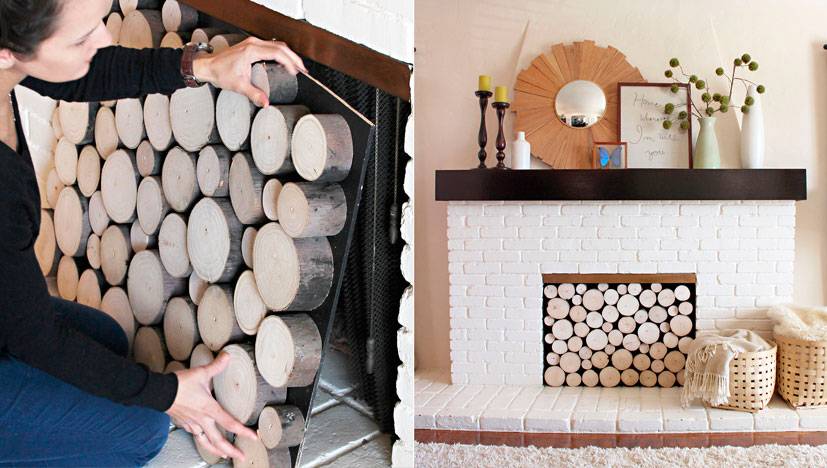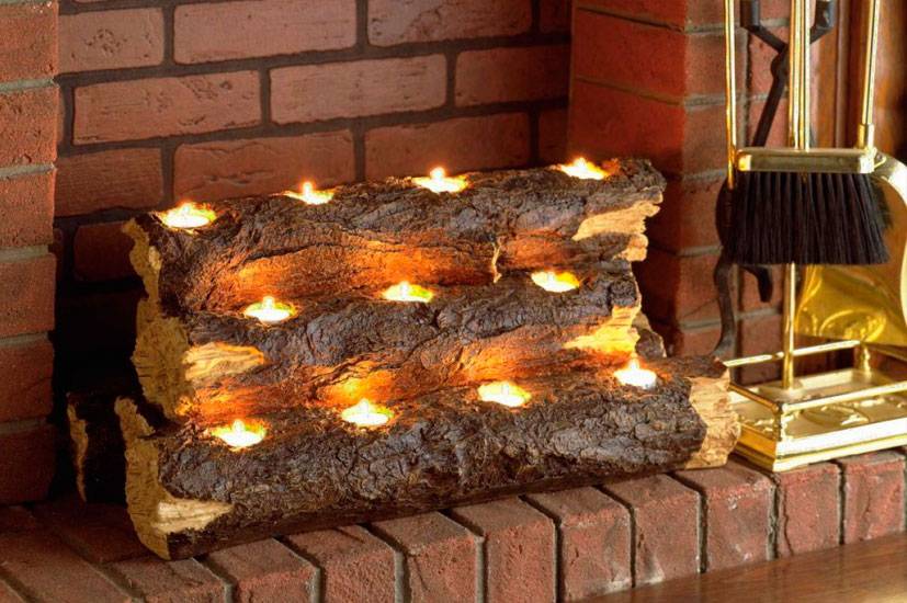 Иногда приверженцы эко-стиля украшают «нутро» камина круглыми деревянными спилами. Этот вариант имитирует кладку поленьев, выглядит стильно. Кроме того, дерево приятно пахнет, и в квартире будет присутствовать тонкий неуловимый аромат свежего сруба. Некоторые умельцы по примеру Папы Карло закрывают очаг своего камина грифельной доской и разрисовывают его по настроению. Чаще всего, разумеется, рисунок изображает пылающий огонь.