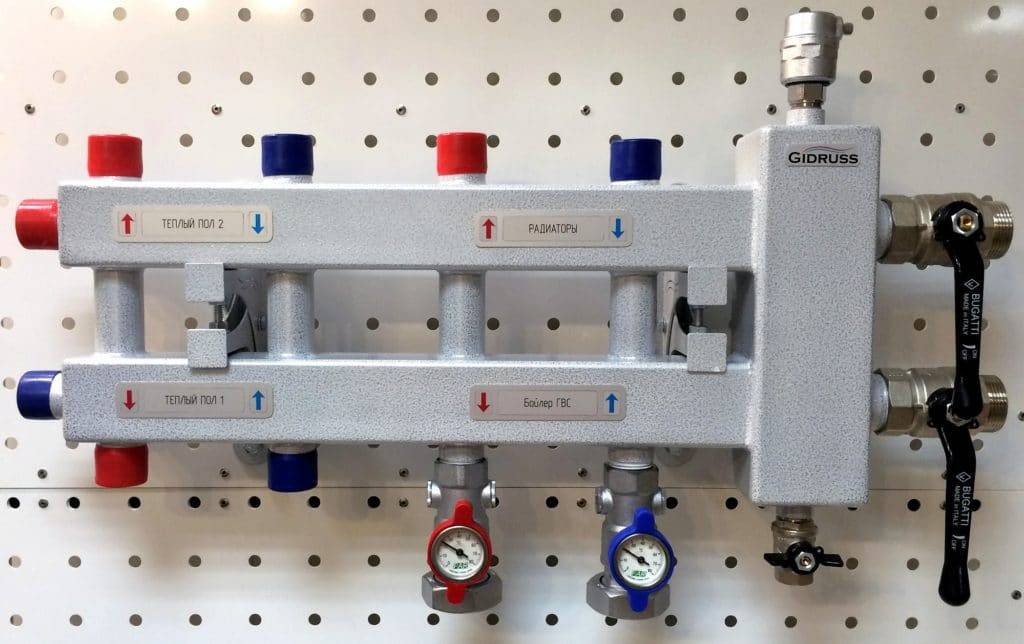 В коллектор, из котла поступает поток нагретой жидкости. Внутри устройства осуществляется разделение теплоносителя по отводам, подключенным к каждой отдельной системе отопления. Дополнительно, коллектор позволяет отключать и ремонтировать отдельные контуры, не отключая обогрева дома.