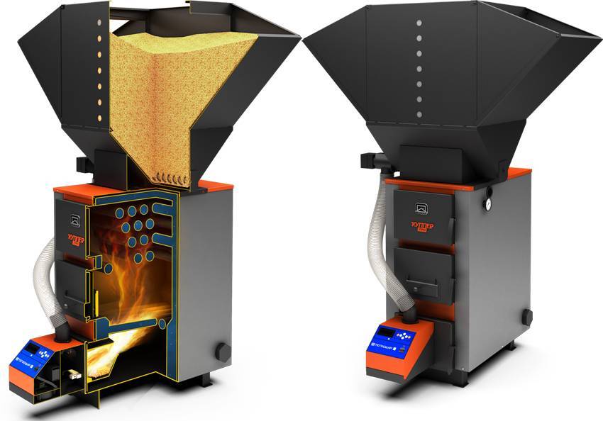 Для подачи гранул или шелухи используется шнековый конвейер, а топливо в него попадает из загрузочного бункера. Объем последнего определяет длительность работы установки. Воздух в зону сжигания поступает принудительно от вентилятора – нагнетателя.