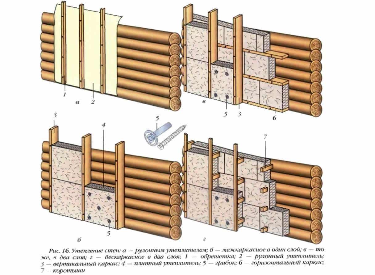 - Утепление стен . Начинается этот этап с обработки стен составом от плесени и грибка. Далее устанавливают вертикальные брусья. Фиксация минваты в промежутках между деревянными элементами осуществляется с помощью степлера.