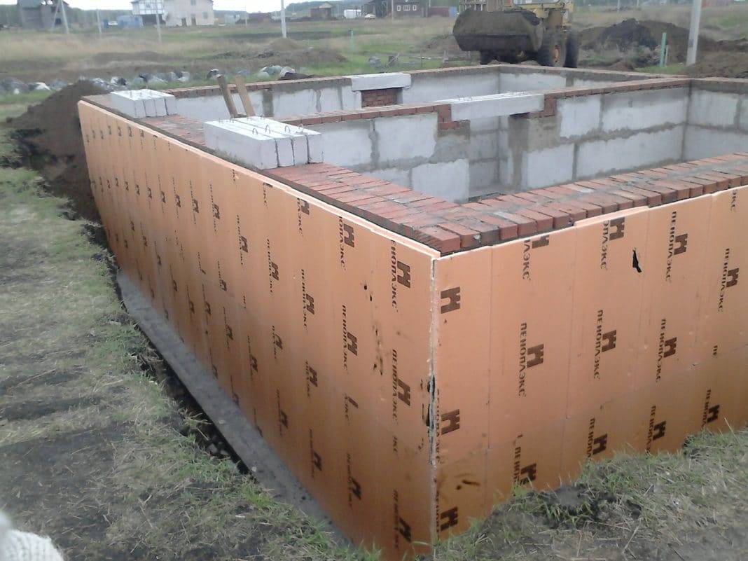 Перед нанесением изоляционного материала наносится специальная мастика, обеспечивающая гидроизоляцию. Затем устанавливается пенопласт. Стыки лучше задуть строительной пеной, так как они будут проводить холод и влагу в помещение. Сверху армируется или затягивается сеткой и штукатурится.