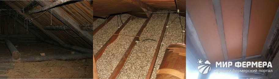 - В образовавшееся пространство засыпают утеплитель. Самый бюджетный вариант использовать опилки. Их смешивают с известью в пропорции 1:15, чтобы защитить древесный материал от влаги и вредителей.