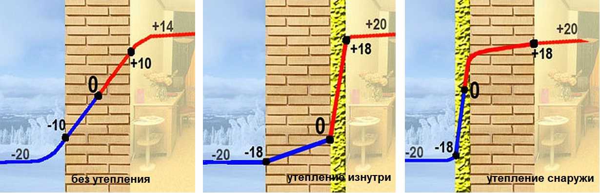 Если наружный утеплитель отсутствует, возможен другой вариант: утеплить стену изнутри. Это поможет точке росы остаться в толще стены, ближе к наружной поверхности. Микроклимат внутри помещения будет комфортнее, а влажность воздуха войдет в границы нормы.