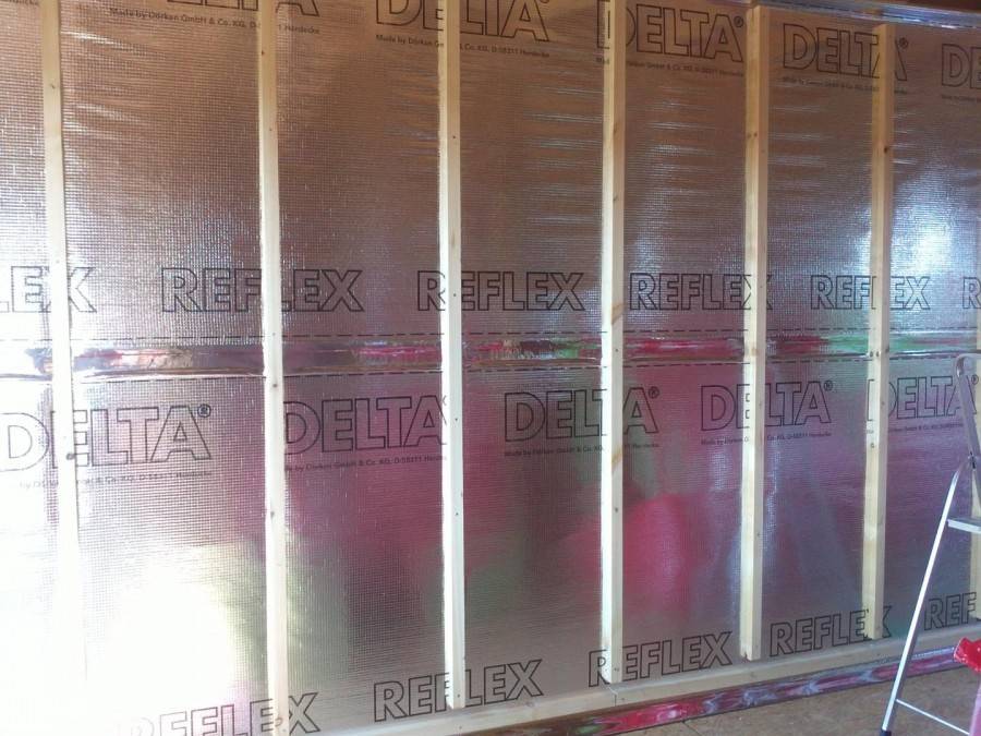 Для внутреннего утепления стен этим материалом необходим деревянный каркас, который позволяет с максимальным эффектом использовать все его свойства. В связи с тем, что пенофол имеет фольгированное покрытие, которое обладает высокой электропроводностью, необходимо проверить изоляцию кабелей, проходящих по стене, во избежание короткого замыкания. При необходимости их можно протянуть в защитном гофрированном рукаве. После изготовления каркаса следует разрезать пенофол ножом на полотна, а затем прикрепить их встык к деревянным стойкам скобами степлера. Затем нужно сделать еще один каркас, оставляя воздушный зазор в 2 см, и закрепить на нем листы или панели, которые впоследствии можно шпаклевать, оклеивать обоями или красить.
